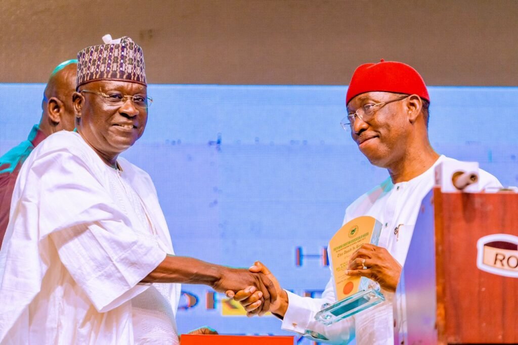 •Delta Governor and Vice-Presidential Candidate of PDP, Senator Dr. Ifeanyi Okowa (right), receiving an Award for Good Governance in Delta and Development of Youths from former Acting Governor of Adamawa State, James Barka(left) on behalf of Youth Wing in Christian Association of Nigeria (YOWICAN) in the 19 Northern States, in Abuja . Pix Government House, Asaba.