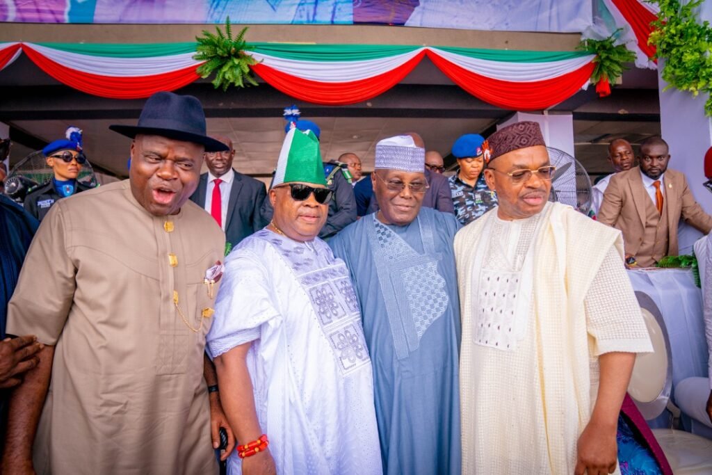 •Presidential candidate of the Peoples Democratic Party and former Vice President of Nigeria, Atiku Abubakar (2nd R); newly sworn-in governor of Osun State, Senator Ademola Adeleke; governors of Bayelsa, Duoye Diri (L); Akwa Ibom, Udom Emmanuel during the inauguration of Governor Adeleke in Osogbo on Sunday.