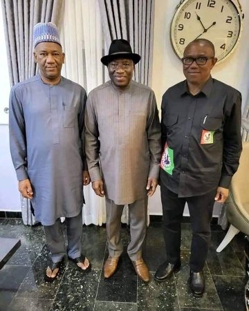 •Former President Goodluck Jonathan flanked by Mr. Peter Obi (r) and Yusuf Datti-Ahmed (l)...during the visit
