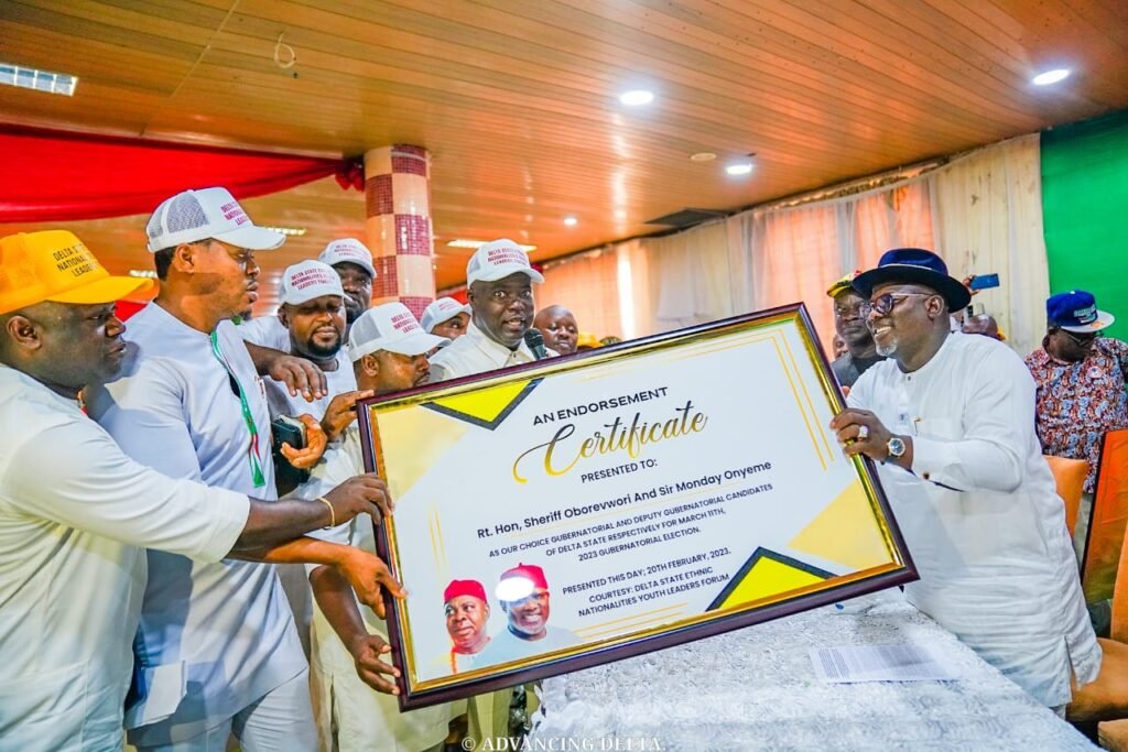 The Delta State Ethnic Nationalities Youth Leaders Forum, on Monday, February 20th, 2023, endorsed Atiku Abubakar, Governor Ifeanyi Okowa for President and Vice President respectively, the State PDP Governorship Candidate, Rt Hon Sheriff Oborevwori and his running mate, Sir Monday Onyeme, for the 2023 general elections.