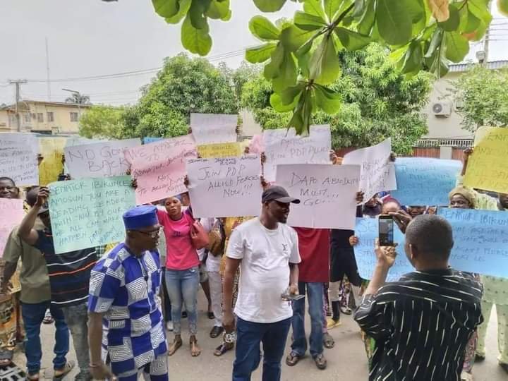 The protesters carried placards with different inscriptions conveying their grievances, some of which read, “Dapo Abiodun must go”, “Senator Ibikunle Amosun you area a leading leader, with you buy our side, we can all make this happen”, “Senator Ibikunle Amosun, please join PDP allied forces now”, among others.