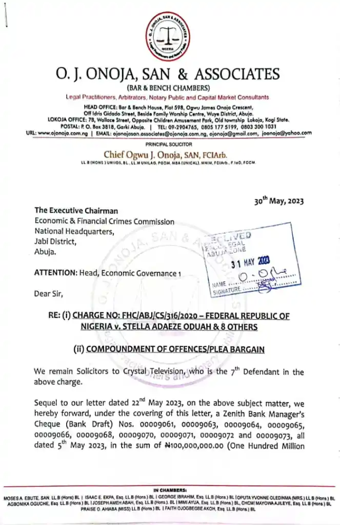 This is because a decoy letter from Crystal Television (one of the defendants charged with Senator Oduah) to the EFCC Chairman dated 30th May, 2023, which was copied to Registrar, Federal High Court  7 Abuja promising to refund some of the alleged laundered money is to be brought up to stop her arraignment scheduled for 5th June, 6th June, 7th June and 8th June 2023.