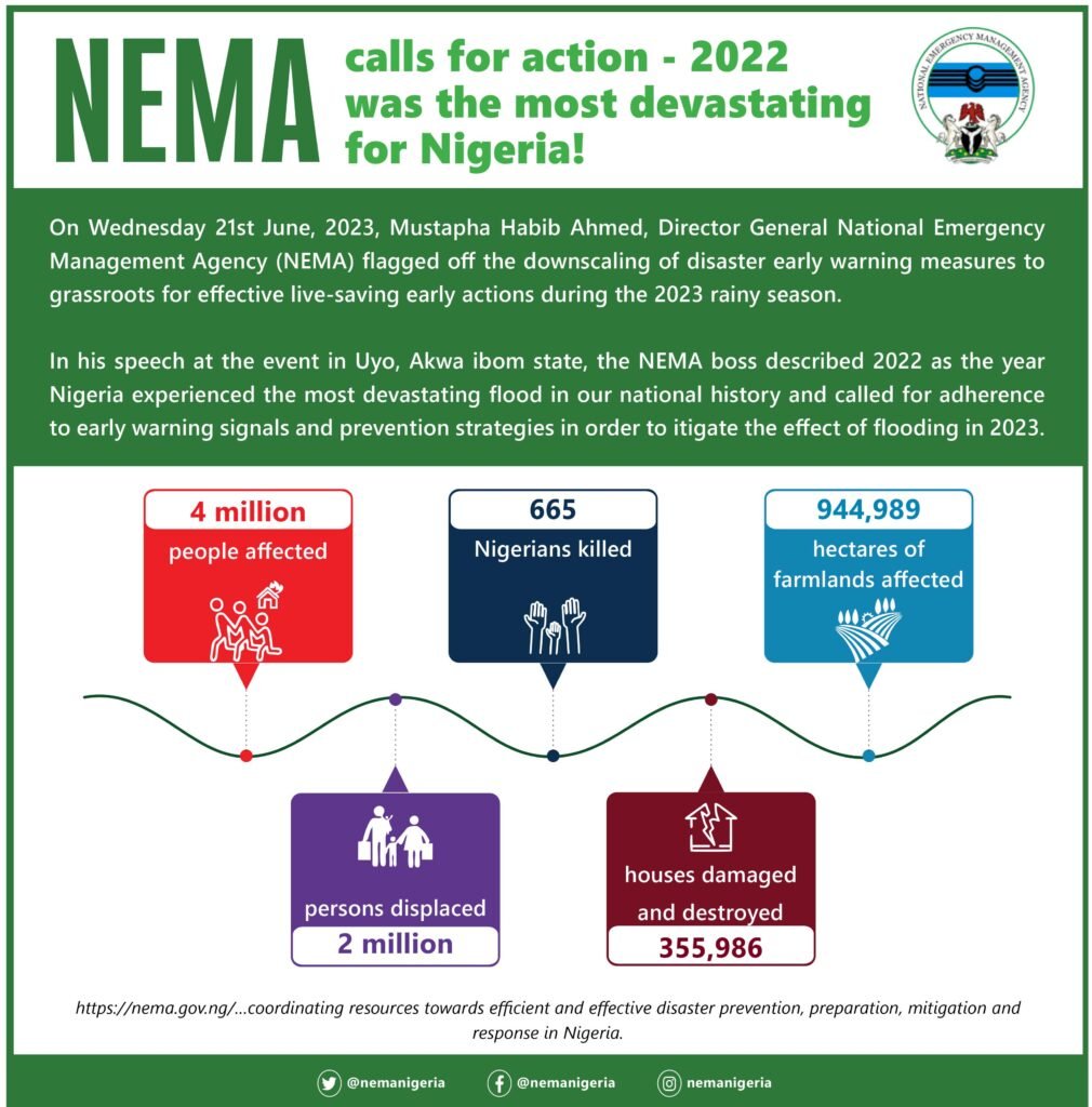Speaking to the imperative of awareness creation and early warning signal measures as critical for flood prevention, Ahmed noted that Nigeria suffered the most devastating incident of flooding in 2022 during which 665 Nigerians were killed and over 2 million persons displaced.