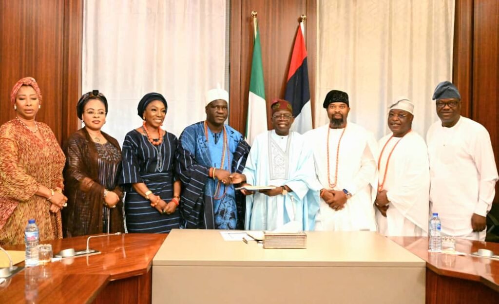 *L-R: Hon. Nnenna Elendu Ukeje, Chief (Mrs) Bimbola Fadamilola, Olori Adedoyin Alao, Olugbon of Orile-Igbon, HRH Oba Francis Olusola Alao, President Bola Tinubu, Otunba Tomi Araromi, Akogun Bolaji Adigun and Prof. Adeolu Akande when the Olugbon led a delegation to visit President Tinubu at the Presidential Villa, Abuja...Friday