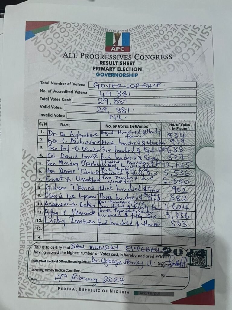 The last may not have been heard on the governorship primary election conducted in Edo State on Saturday, February 17, 2024 by All Progressives Congress (APC) as the result sheet of the exercise shows that  Senator Monday Okpebholo (Edo Central) scored 12, 145 votes to beat Hon Dennis Idahosa, who polled 5, 536 votes.
