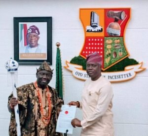Oyo State governor, Seyi Makinde, has presented the certificate and staff of office to the newly appointed Alaafin of Oyo, Oba Abimbola Owoade.