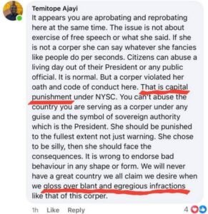While reacting to the story shared on Facebook, Tope stated that Raye had violated her oath and code of conduct as a corper and is expected to be served the capital punishment under NYSC.