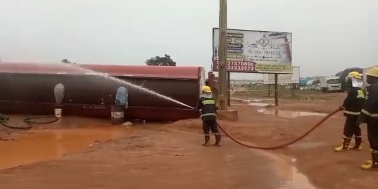 “The firemen swiftly swung into action by covering the spillage with chemical foam compound to neutralize the flammability of the content, so as to prevent it from attracting naked fire that might lead to explosion. The operation was carried out successfully and normalcy has been restored back for the road users.