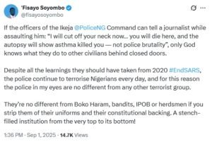 Soyombo said this on X, while revealing the threat police officers attached to the Ikeja police command in Lagos state allegedly made during assaul on a journalist.