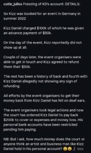 Cutie Juls reports that Kizz Daniel was booked for an event in Germany in 2022 and charged $100,000, but was paid half of his fee .