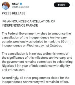 The statement also urged Nigerians to continue supporting President Bola Ahmed Tinubu’s reforms, while expressing regret for any inconvenience the cancellation may cause.