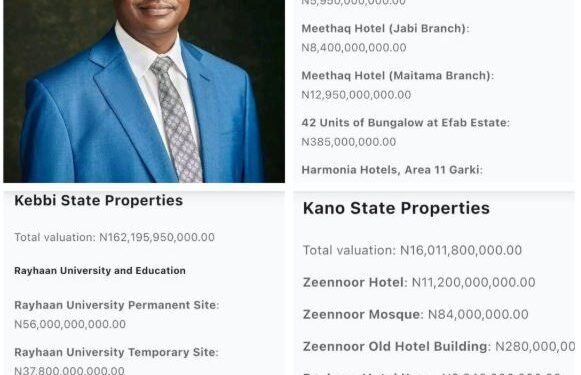 The properties in Kebbi state are valued at N162,195,950,000, while the assets in Kano state are said to be worth N16,011,800,000, and the value of the FCT properties was put at N34,685,000,000.