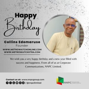The Nigerian National Petroleum Corporation (NNPC) Limited has extended warm birthday wishes to Hon. Collins Edomaruse, Publisher of WWW.METROWATCHXTRA.COM and WWW.METROWATCHONLINE.COM, as he marks his birthday today, January 18.