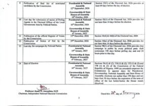 “Governorship and State Houses of Assembly campaigns will commence on Sept. 9, 2026.