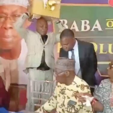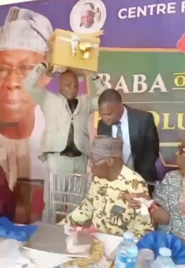 Upon reaching the high table where Obasanjo was seated, he carefully placed the box down.